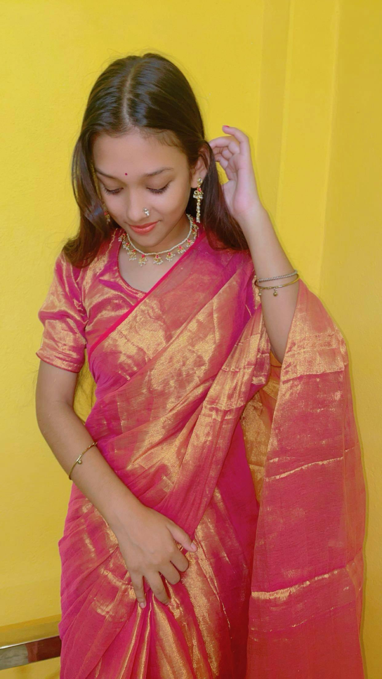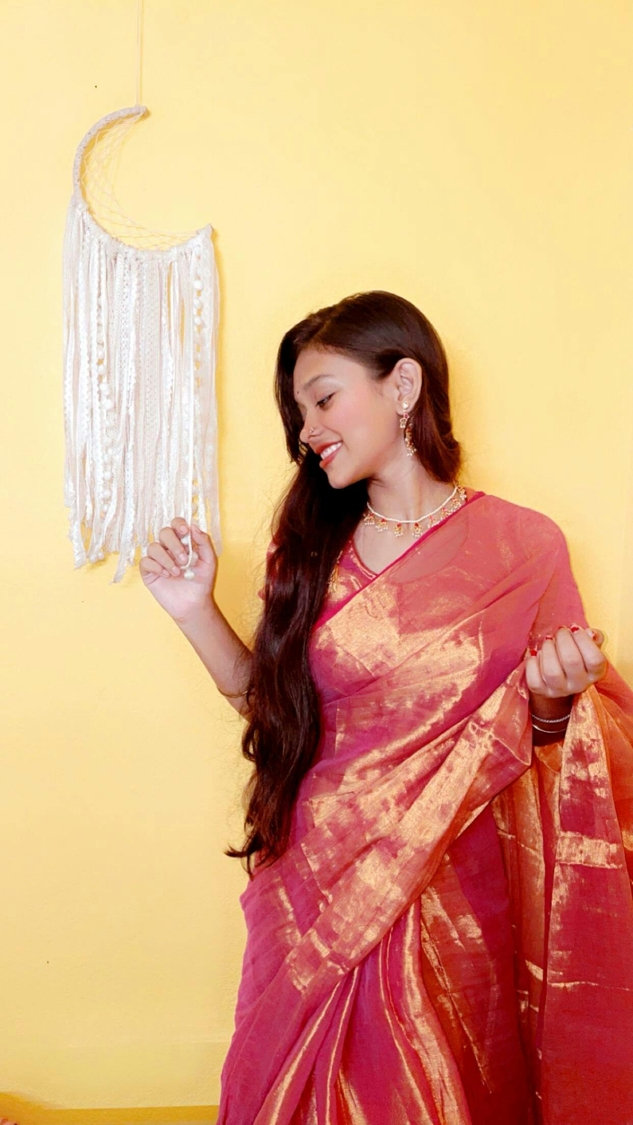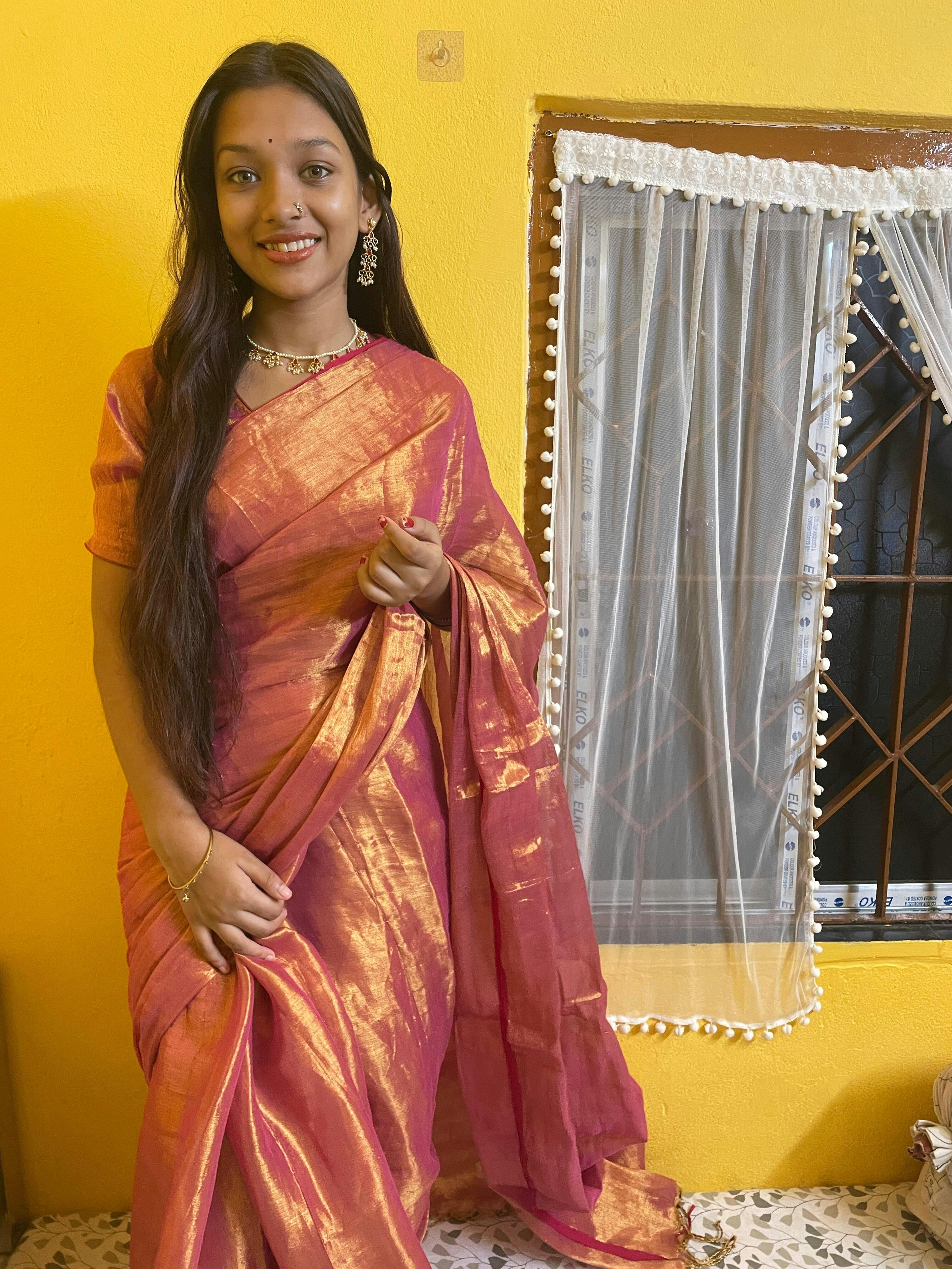 Avoid rough surfaces and sharp objects while wearing the saree to prevent tears