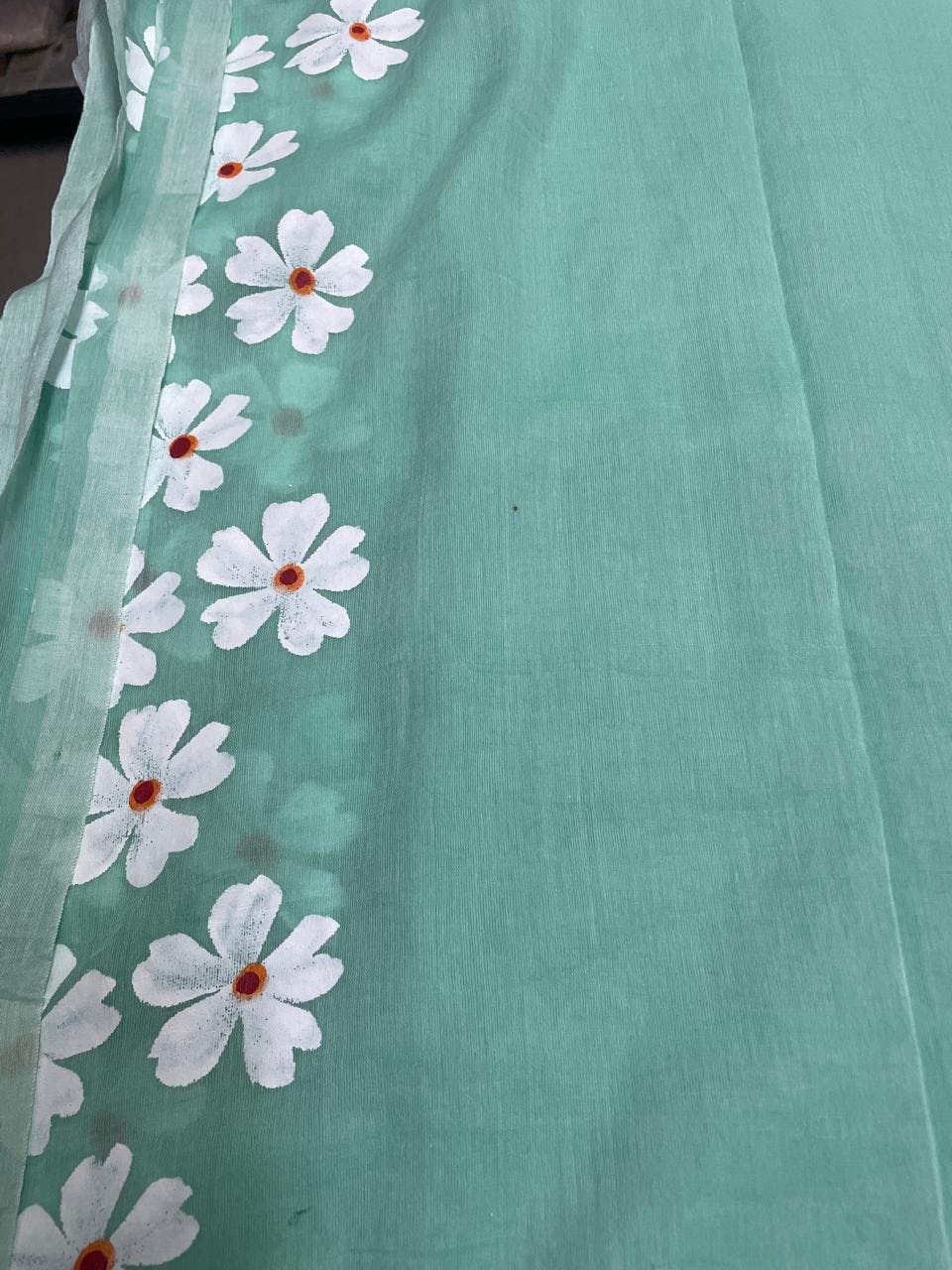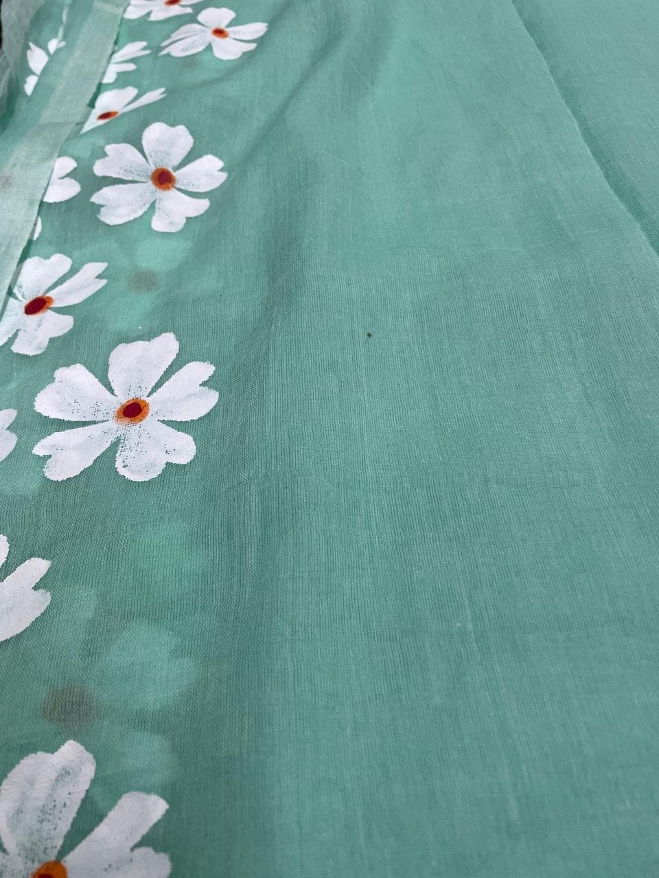 Saaj Hara | Pastel Green Handloom Cotton Saree with Delicate Handcrafted Floral Art